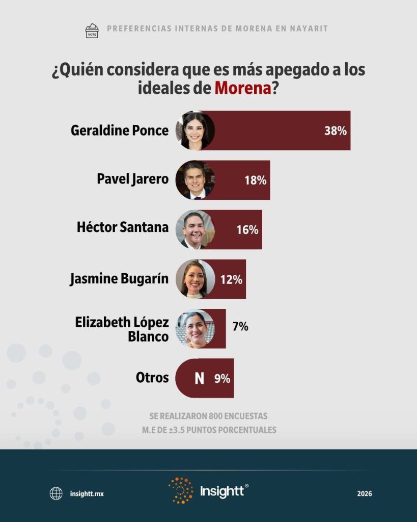 La más reciente medición de Innsightt sobre preferencias internas de Morena en Nayarit coloca a la presidenta municipal de Tepic, Geraldine Ponce, al frente con 33% de intención, consolidando el primer lugar y ampliando su ventaja en la contienda interna rumbo a la definición de la candidatura a la gubernatura en 2027.