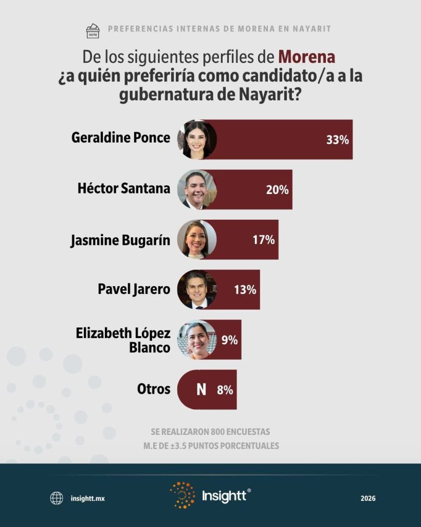 Tepic.— La más reciente medición de Innsightt sobre preferencias internas de Morena en Nayarit coloca a la presidenta municipal de Tepic, Geraldine Ponce, al frente con 33% de intención, consolidando el primer lugar y ampliando su ventaja en la contienda interna rumbo a la definición de la candidatura a la gubernatura en 2027.