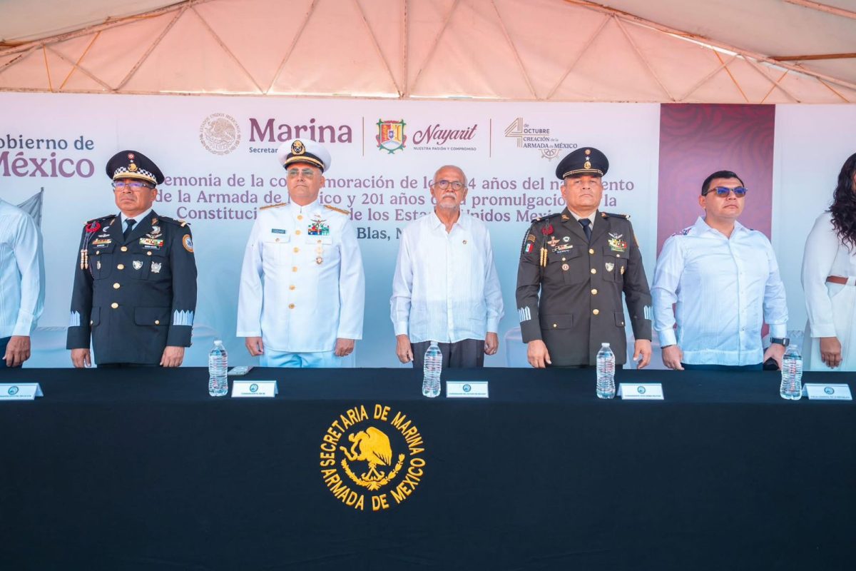 Este sábado, el gobernador del estado de Nayarit, Miguel Ángel Navarro Quintero, asistió a la ceremonia de la conmemoración de los 204 años del nacimiento de la Armada de México y 201 años de la promulgación de la Constitución Federal de los Estados Unidos Mexicanos, realizada en las instalaciones de la Décima Zona Naval, en el municipio de San Blas.