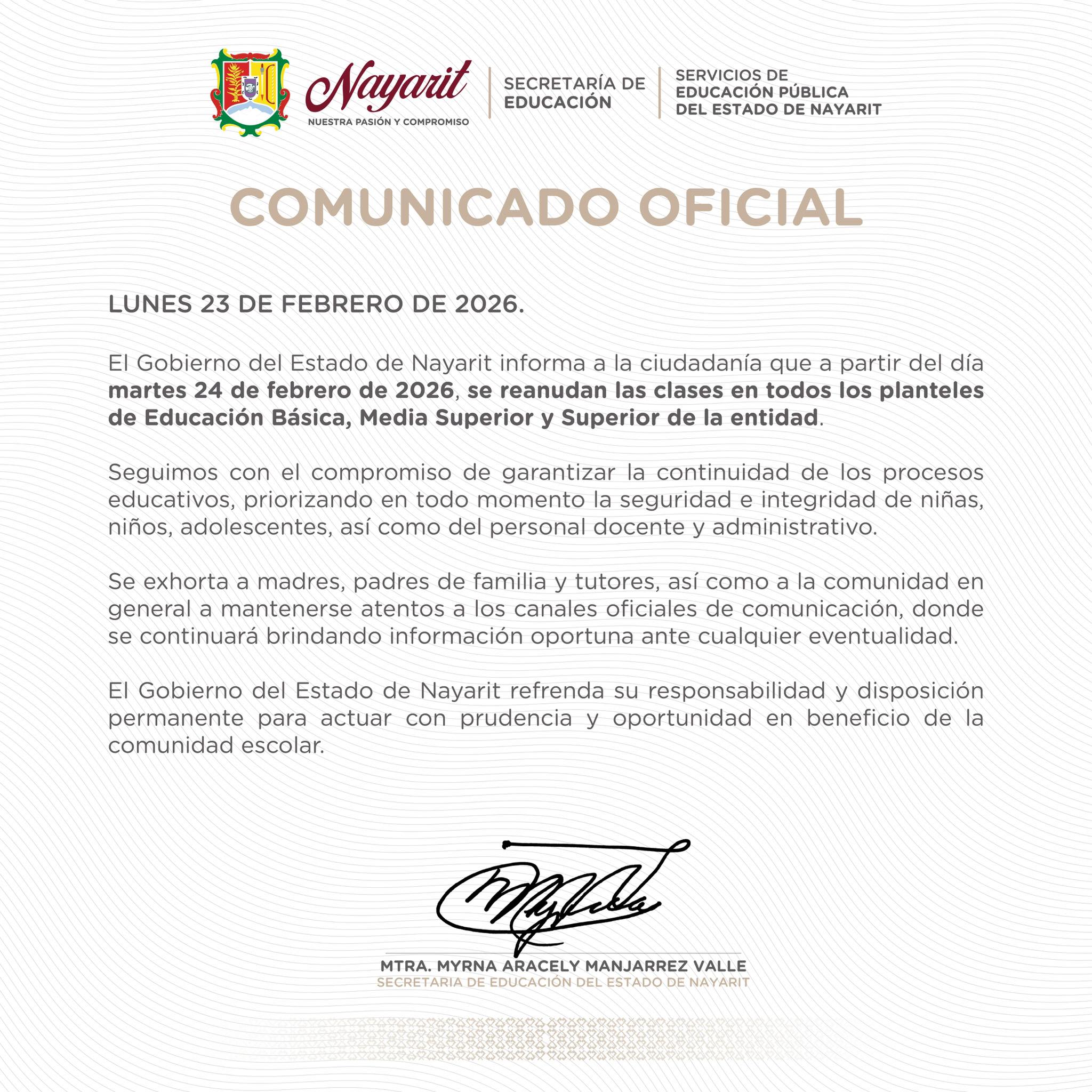 El Gobierno del Estado de Nayarit, a través de la Secretaría de Educación y los Servicios de Educación Pública del Estado de Nayarit, informa a la ciudadanía que a partir del martes 24 de febrero de 2026 se reanudan las clases en todos los planteles de Educación Básica, Media Superior y Superior de la entidad.