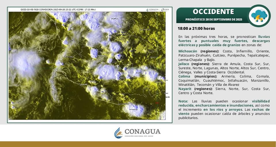 En las próximas tres horas, se pronostican lluvias fuertes a puntuales muy fuertes, descargas eléctricas y posible caída de granizo en Nayarit, (regiones): sierra, norte, sur, costa sur, centro y costa norte.