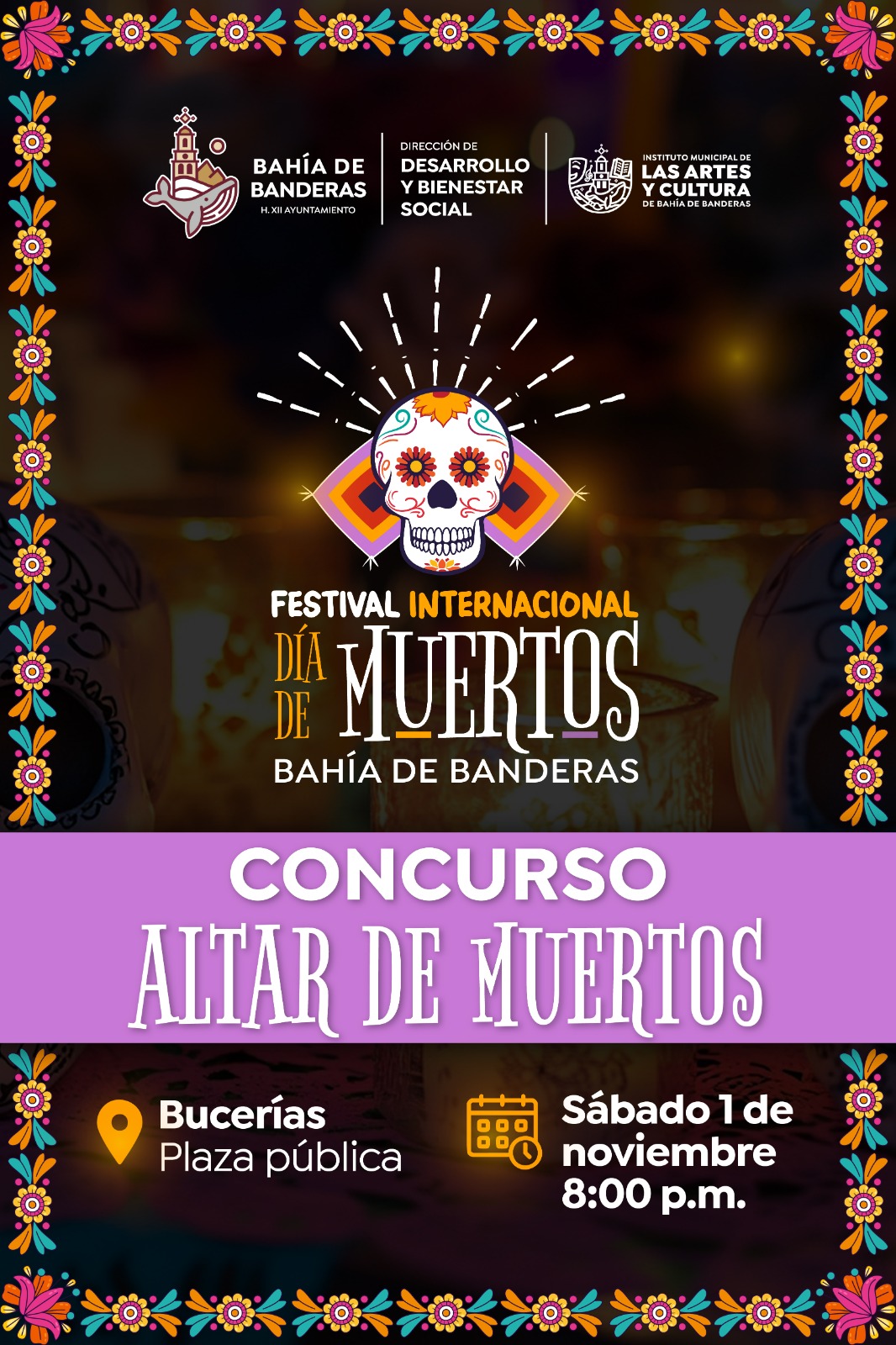 El Instituto Municipal de las Artes y Cultura de Bahía de Banderas, perteneciente a la Dirección de Desarrollo y Bienestar Social del H. XII Ayuntamiento, invita a la población a participar en el Concurso de Altares de Muertos 2025, esto en el marco del Festival Internacional del Día de Muertos.