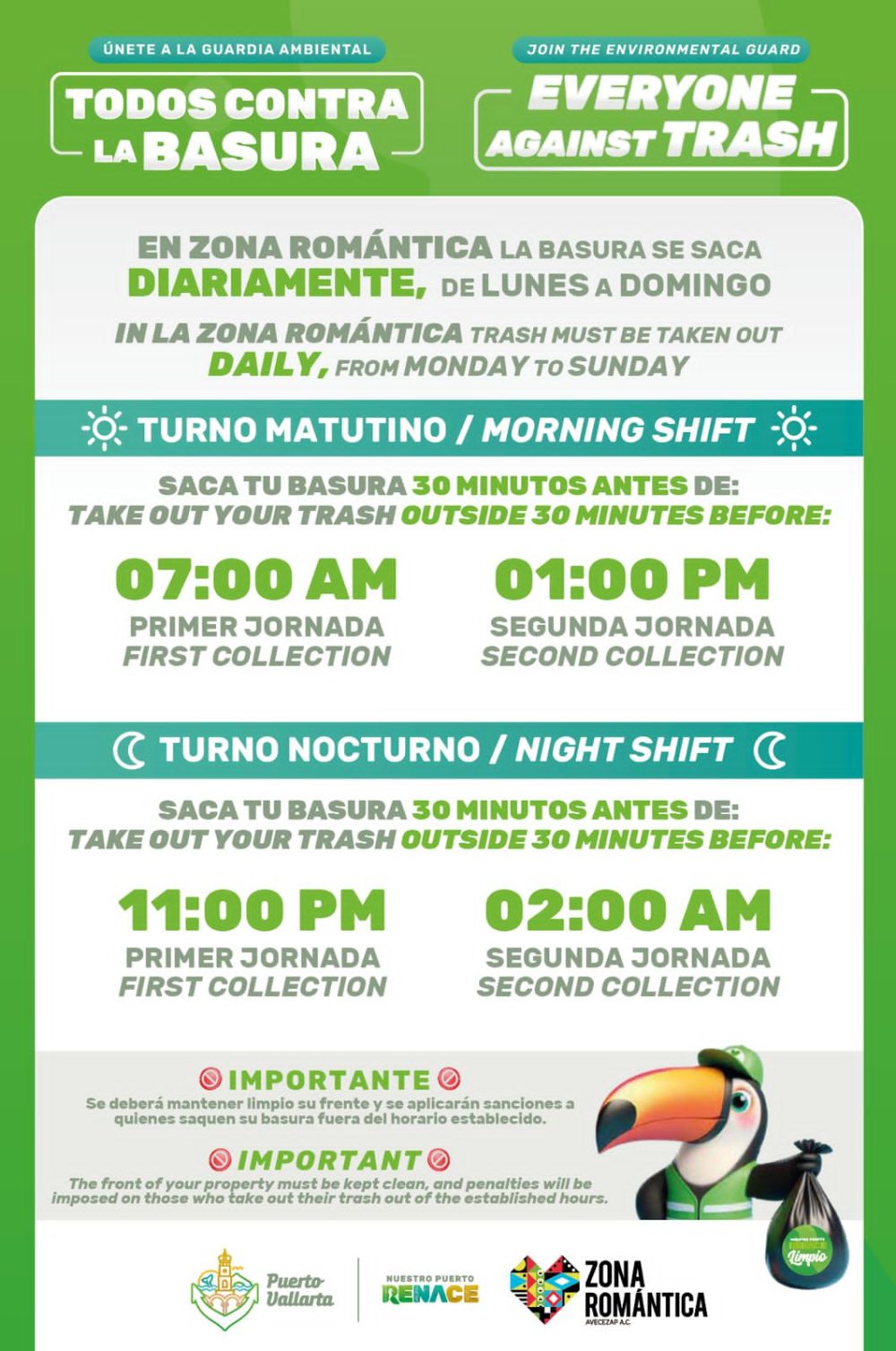 Se solicita a los vecinos sacar la basura 30 minutos antes del horario establecido, ya que de lo contrario se aplicarán sanciones. Además, se les recuerda mantener limpio el frente de sus propiedades. El Gobierno de Puerto Vallarta trabaja para garantizar un entorno limpio y seguro para los residentes y visitantes de la Zona Romántica.