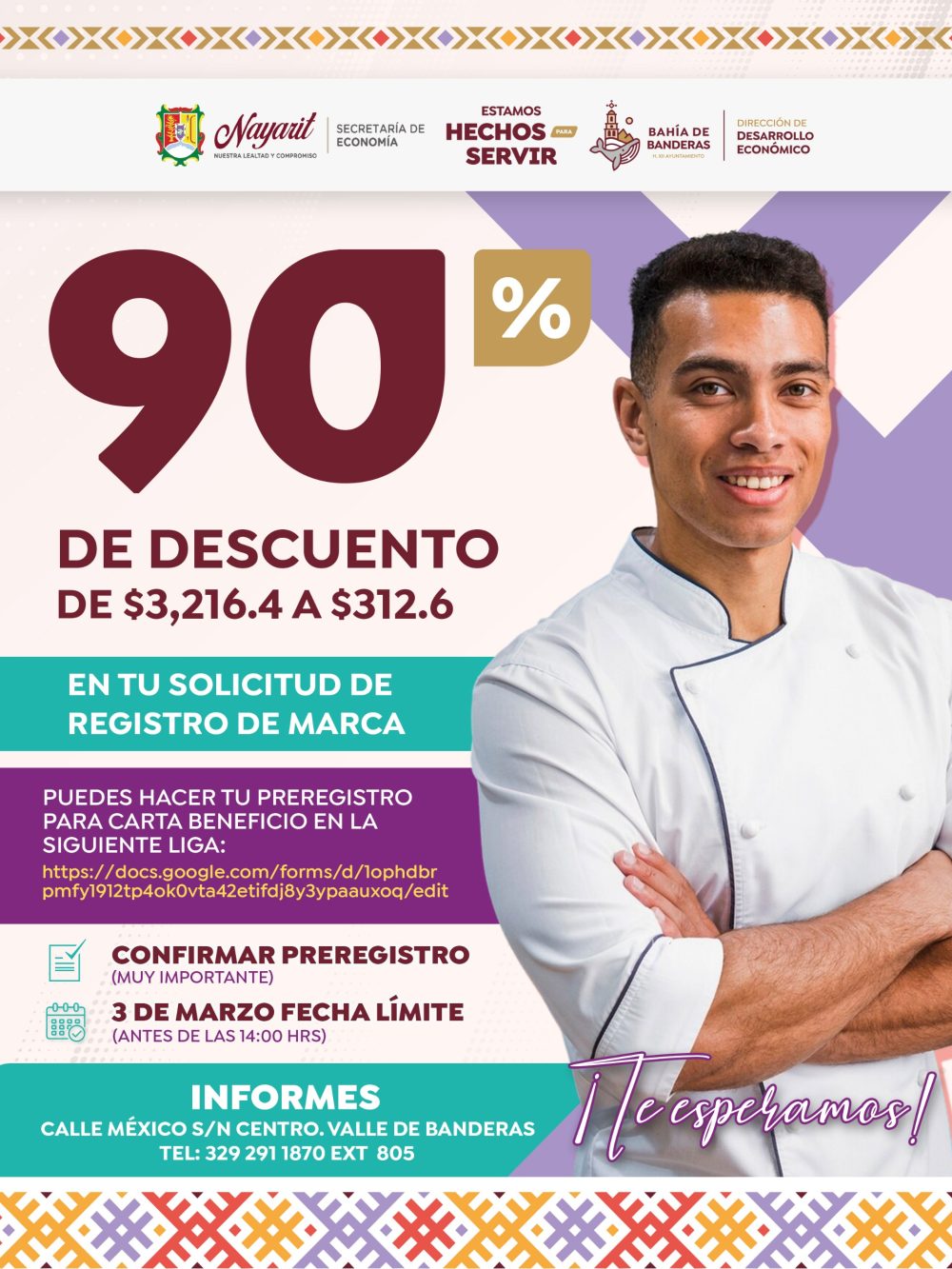 Para mayores informes, pueden acudir a la Dirección de Desarrollo Económico, ubicada en Calle México s/n, Centro, Valle de Banderas, o comunicarse al teléfono 329 291 1870 extensión 805.