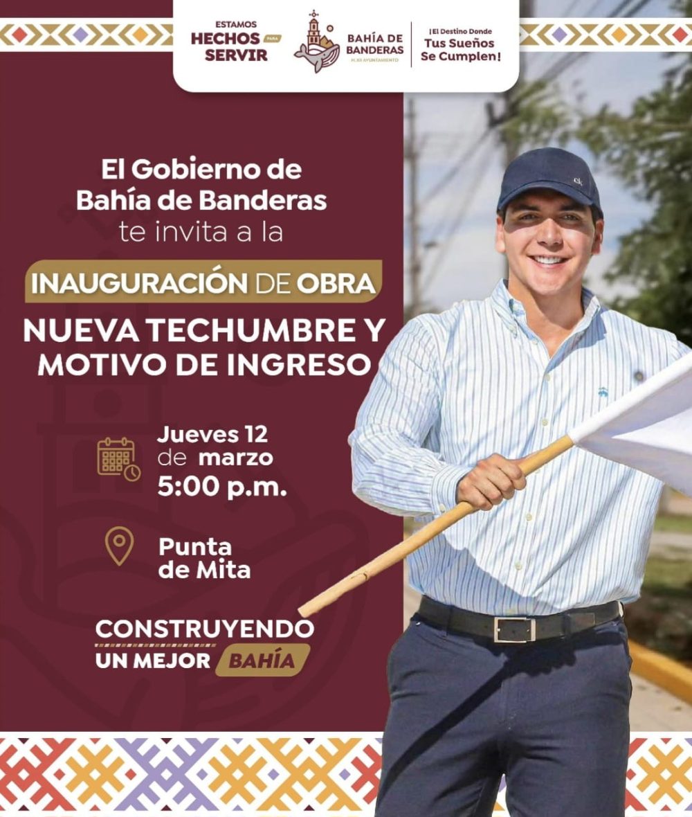 El Gobierno Municipal de Bahía de Banderas, que encabeza el presidente municipal Héctor Santana, invita a la ciudadanía a participar en la inauguración de la obra de nueva Techumbre y Motivo de Ingreso en la localidad de Punta de Mita, un proyecto que forma parte de las acciones de mejora de la infraestructura urbana impulsadas por la administración municipal.