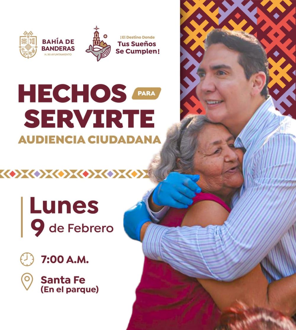 El Gobierno Municipal de Bahía de Banderas invita a la ciudadanía a participar en la próxima Audiencia Ciudadana, encabezada por el presidente municipal Héctor Santana, misma que se llevará a cabo el próximo lunes 9 de febrero en punto de las 7:00 de la mañana, en el Fraccionamiento Santa Fe.