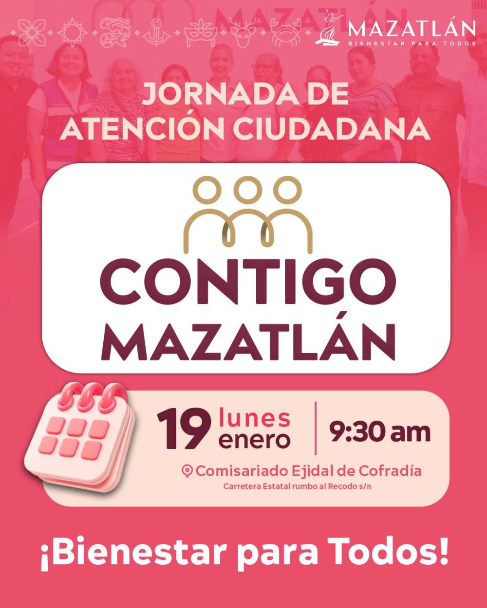 Te esperamos este lunes 19 de enero, a las 9:30 a.m., en el Comisariado Ejidal de Cofradía, ubicado en la Carretera Estatal rumbo al Recodo s/n, para acercarte servicios y atención directa.