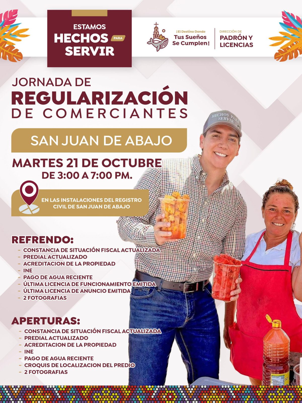 ​El Gobierno Municipal de Bahía de Banderas, que encabeza el presidente municipal Héctor Santana, a través de la Dirección de Padrón y Licencias, realizará una Jornada de Regularización de Comerciantes este próximo martes en un horario de 3pm a 7pm, en las instalaciones del Registro Civil de San Juan de Abajo.
