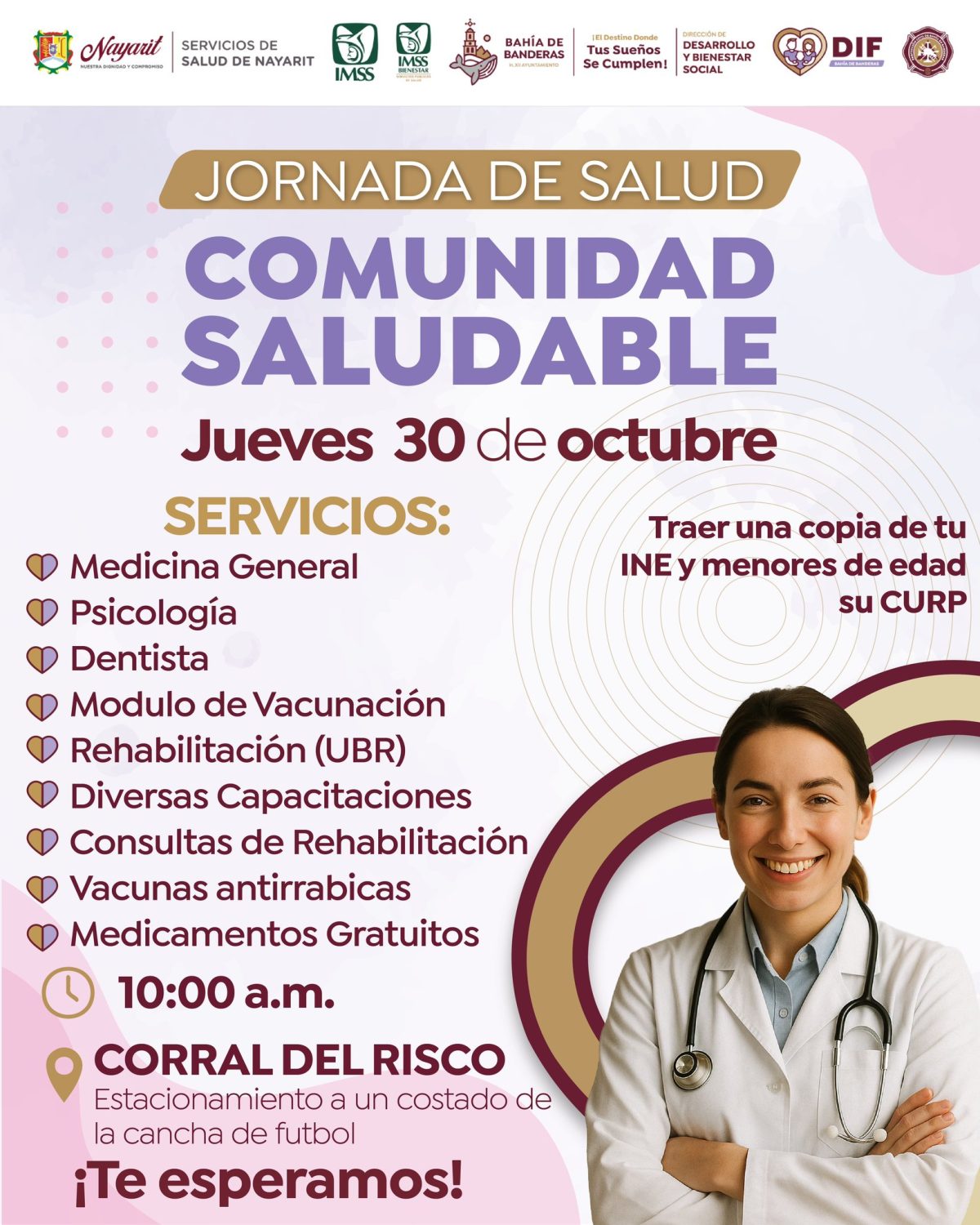 El jueves 30 de octubre nuestra presidenta del DIF Bahía de Banderas , Lic. Margui Zuñiga de Santana y las distintas instituciones invitadas, estaremos en la Plaza Pública de Corral del Risco con nuestra Jornada de Salud “Comunidad Saludable”.
