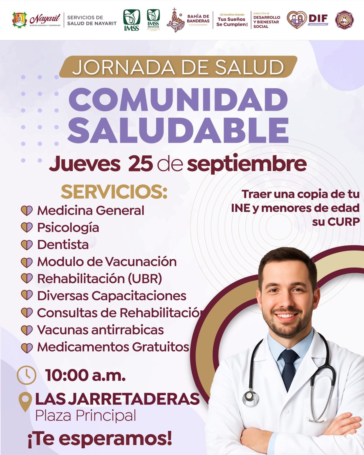 Este jueves 25 de septiembre llevaremos a cabo nuestra Jornada de Salud – Comunidad Saludable, acercando servicios médicos y de bienestar totalmente gratuitos para ti y tu familia.