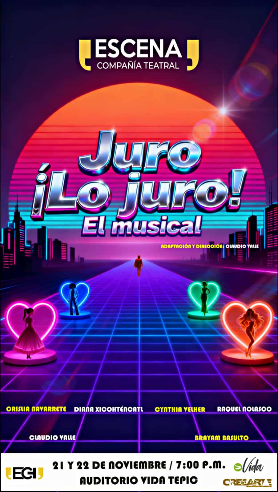 «Juro ¡Lo Juro! el musical» una puesta en escena colorida y ágil, inmersa en la cultura pop mexicana de los años ochenta, plena de nostalgia, humor y drama se presenta este viernes 21 y sábado 22 de noviembre a las siete de la noche en el auditorio “Vida Tepic”, ubicado en la colonia San Juan de la capital nayarita.