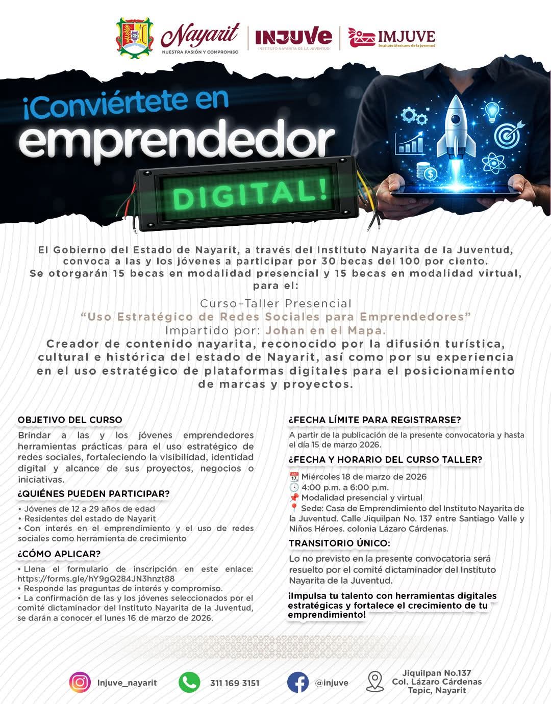 El Gobierno del Estado de Nayarit, a través del Instituto Nayarita de la Juventud (INJUVE), te invita a convertirte en un emprendedor digital.