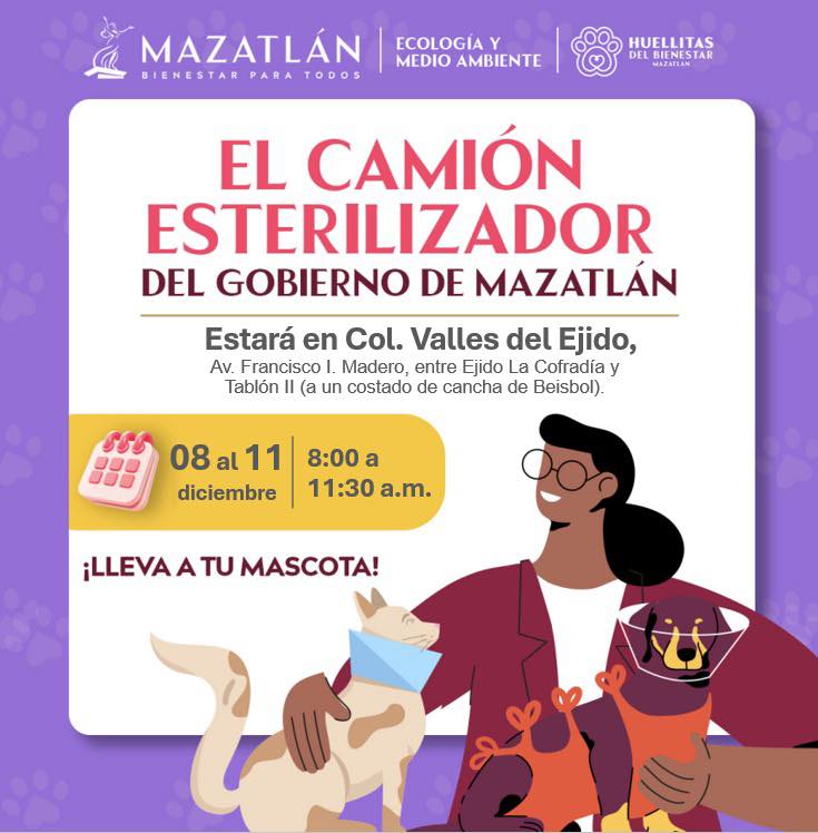 Te invitamos a llevar a tu mascota al camión esterilizador del Gobierno de Mazatlán, que estará en la Col. Valles del Ejido, sobre Av. Francisco I. Madero, entre Ejido La Cofradía y Tablón II (a un costado de la cancha de beisbol), del 8 al 11 de diciembre, de 8:00 a 11:30 a.m.