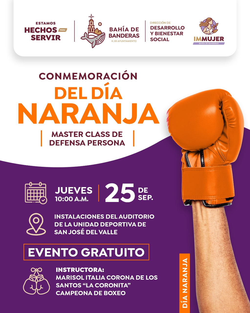 En conmemoración del Día Naranja, el H. XII Ayuntamiento de Bahía de Banderas, a través de la Dirección de Desarrollo y Bienestar Social y el IMMUJER, realizará una Master Class de Defensa Personal en el auditorio de la Unidad Deportiva de San José del Valle.