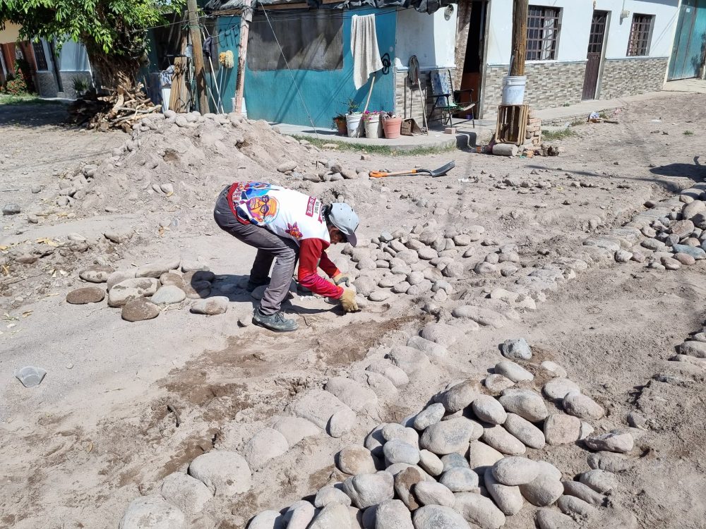 Personal de la dirección de Servicios Públicos está realizando trabajos de mantenimiento del empedrado sobre este punto.