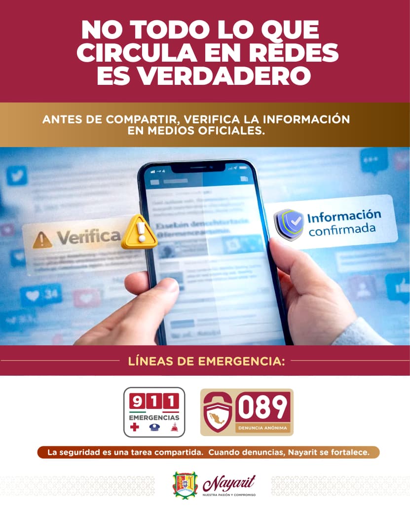 Navarro Quintero pidió que ante cualquier situación real de riesgo o emergencia reporten de inmediato al 089 o al 911. Reiteró que informarse bien y actuar a tiempo también fortalece la estabilidad del estado.