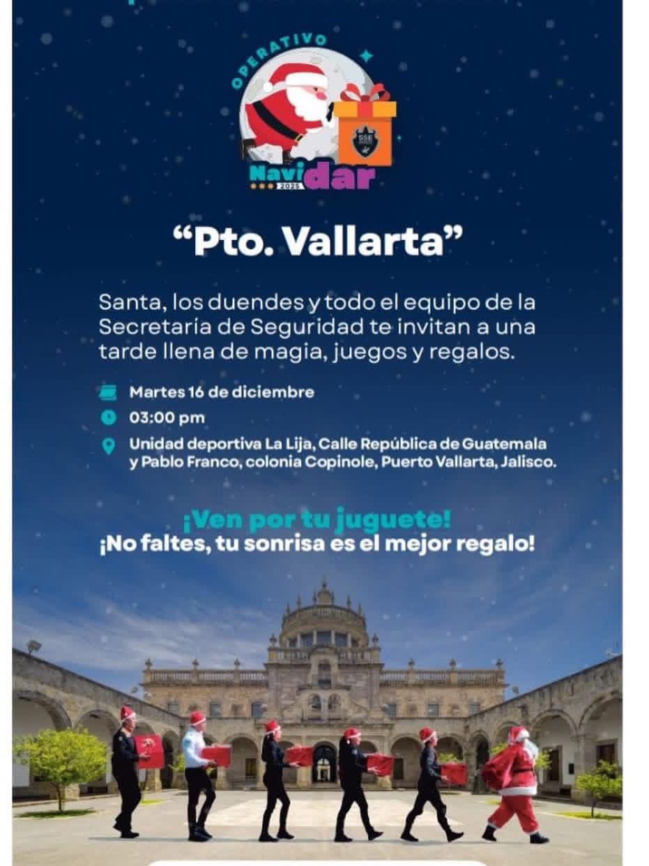 La Secretaría de Seguridad de Jalisco, con el respaldo del gobierno de Luis Munguía González, traerá a Puerto Vallarta la Posada Infantil del Operativo NaviDar, una tarde de magia, juegos y regalos este martes 16 de diciembre a las 3:00 p.m. en la Unidad Deportiva La Lija. Santa y su equipo llegarán para convivir y compartir momentos especiales con todas y todos.