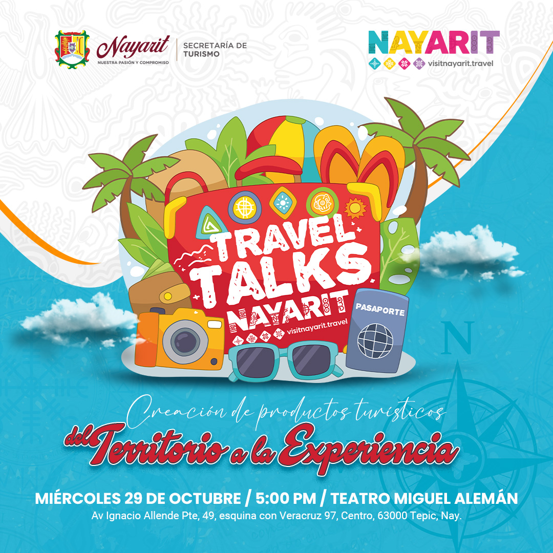 La Secretaría de Turismo del Estado de Nayarit te invita a ser parte del Ciclo de Conferencias Turísticas Travel Talks en su Séptima Edición, un espacio para compartir ideas, experiencias y estrategias que transforman el turismo desde la comunidad, la naturaleza y la innovación.