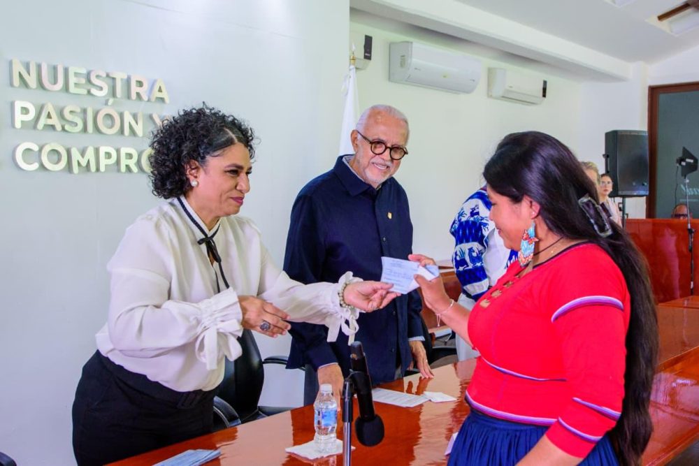 “Con el recurso brindado se pretende recuperar las enseñanzas de nuestras abuelas, plasmándolas en bolsas bordadas para que puedan ser transmitidas de generación en generación. Y con ello, pues la preservación de las cosas, de las bolsas, que tanto nos hacen falta hoy en día. Es la primera vez que realizo un proyecto en la cual fuimos seleccionados. Estoy muy emocionada. Gracias, de igual manera al PACMyC por el vínculo que hay entre nosotros por fortalecer las culturas, los usos y costumbres de los pueblos originarios. Estamos muy contentos, agradecidos y en nombre de todos mis compañeros le damos las gracias, gobernador por este gran apoyo que nos ha brindado a todos nosotros los que estamos aquí presentes”.