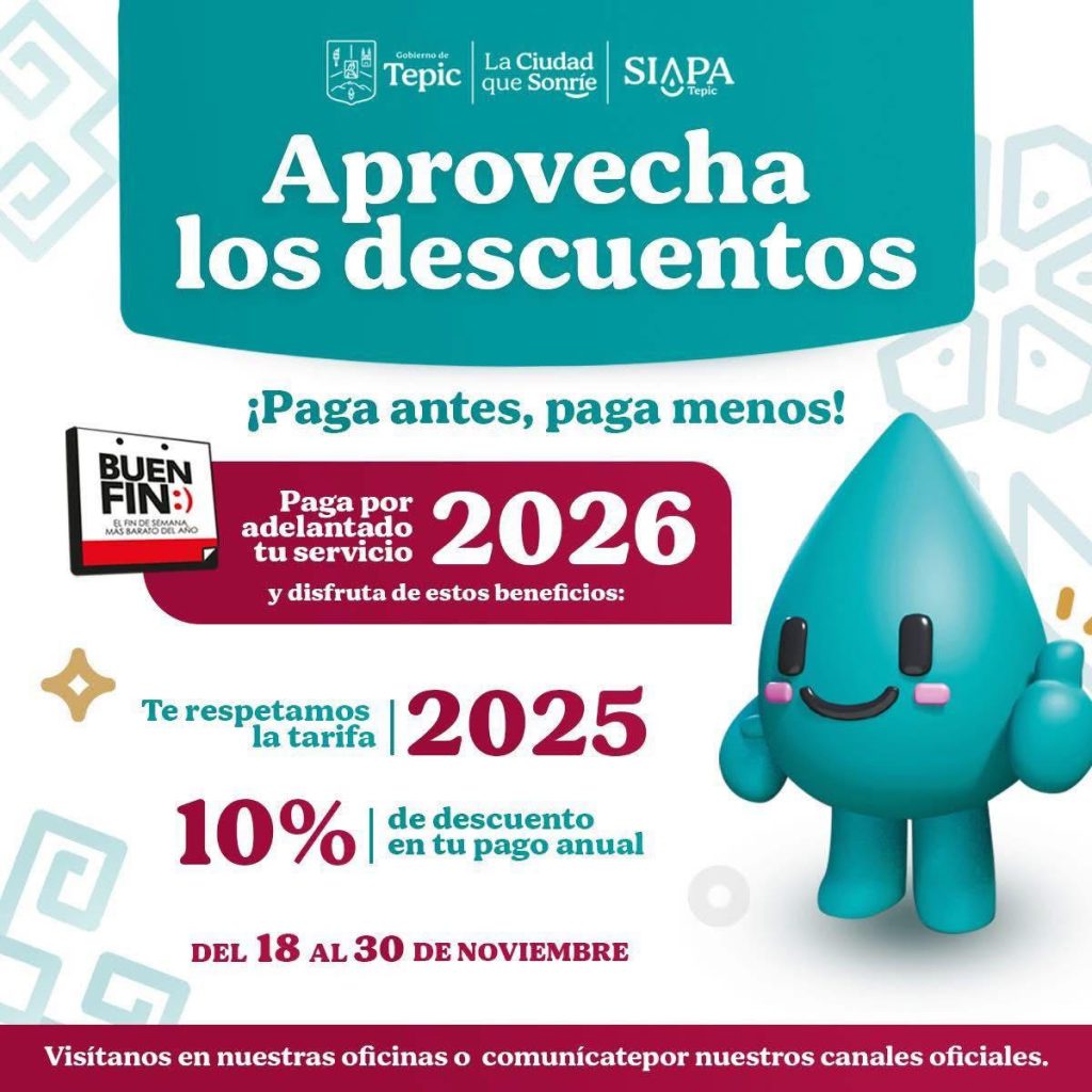 NO HAN TERMINADO LOS DESCUENTOS DEL BUEN FIN en el SIAPA Tepic, por ejemplo, 10% en pago anual 2026 con tarifa del 2025, válido hasta el 30 de noviembre, informa el gobierno de Geraldine Ponce.