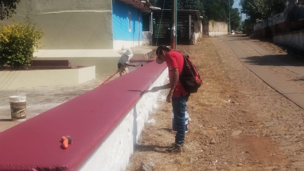 El equipo de Obras Públicas del Gobierno de Xalisco realiza labores de pintura y mantenimiento en la plaza, cancha de usos múltiples y el salón del Comisariado Ejidal de Trigomil.