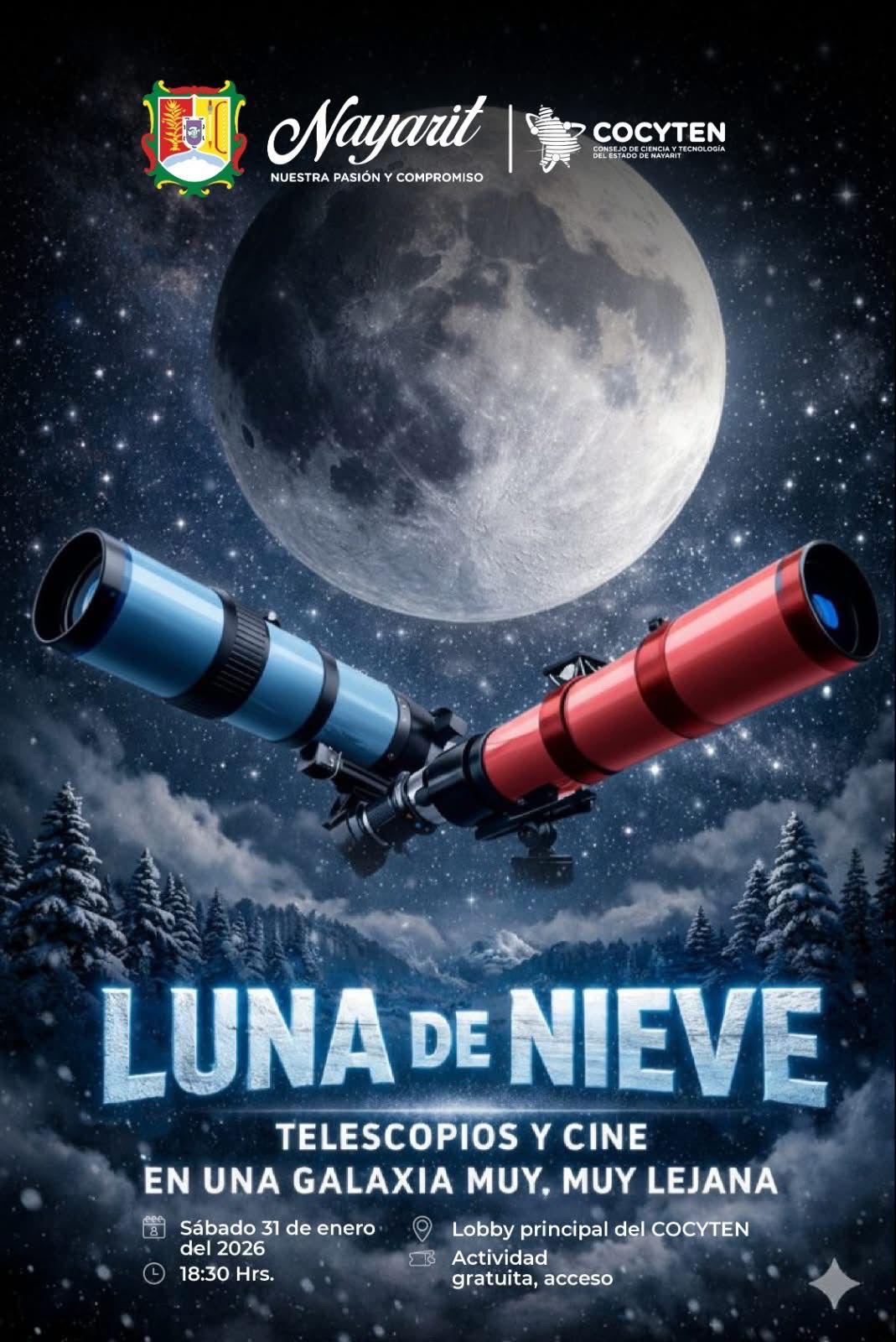 El Gobierno del Estado, a través del Consejo de Ciencia y Tecnología del Estado de Nayarit (COCYTEN) invita a la actividad “Luna de Nieve: Telescopios y cine en una galaxia muy, muy lejana”, una experiencia de divulgación científica y convivencia familiar.