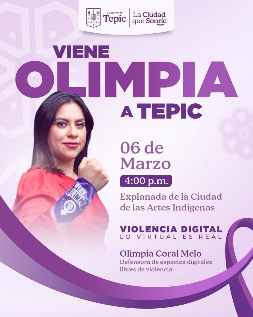 OLIMPIA CORAL MELO ESTARÁ en la capital nayarita, anuncia el Gobierno de Tepic, para impartir la conferencia “Violencia digital: lo virtual es real”, en el marco del Día Internacional de la Mujer. Será el viernes 6 de marzo a las 4:00 de la tarde en la explanada de la Ciudad de las Artes Indígenas.