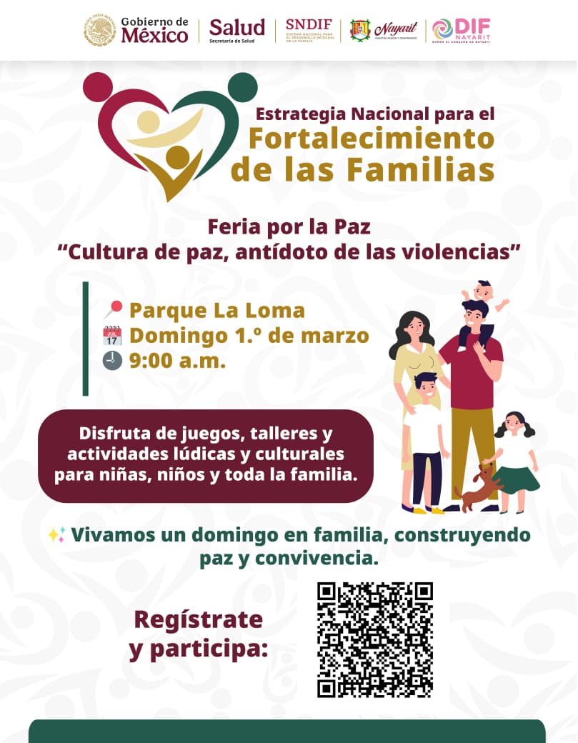 Beatriz Estrada y el Sistema DIF Nayarit te invitan a la Feria por la Paz “Cultura de paz, antídoto de las violencias”, un espacio donde niñas, niños y familias podrán disfrutar de actividades recreativas y culturales que fomentan la sana convivencia, en un ambiente de alegría, respeto y armonía para todas y todos.