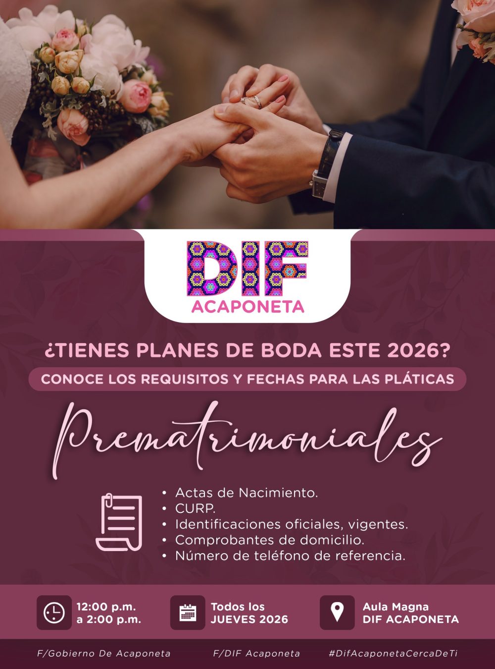 DIF Acaponeta los invitamos a nuestras 𝑷𝒍𝒂́𝒕𝒊𝒄𝒂𝒔 𝑷𝒓𝒆𝒎𝒂𝒕𝒓𝒊𝒎𝒐𝒏𝒊𝒂𝒍𝒆𝒔, un requisito esencial para su boda civil y una excelente oportunidad para fortalecer su comunicación como pareja.