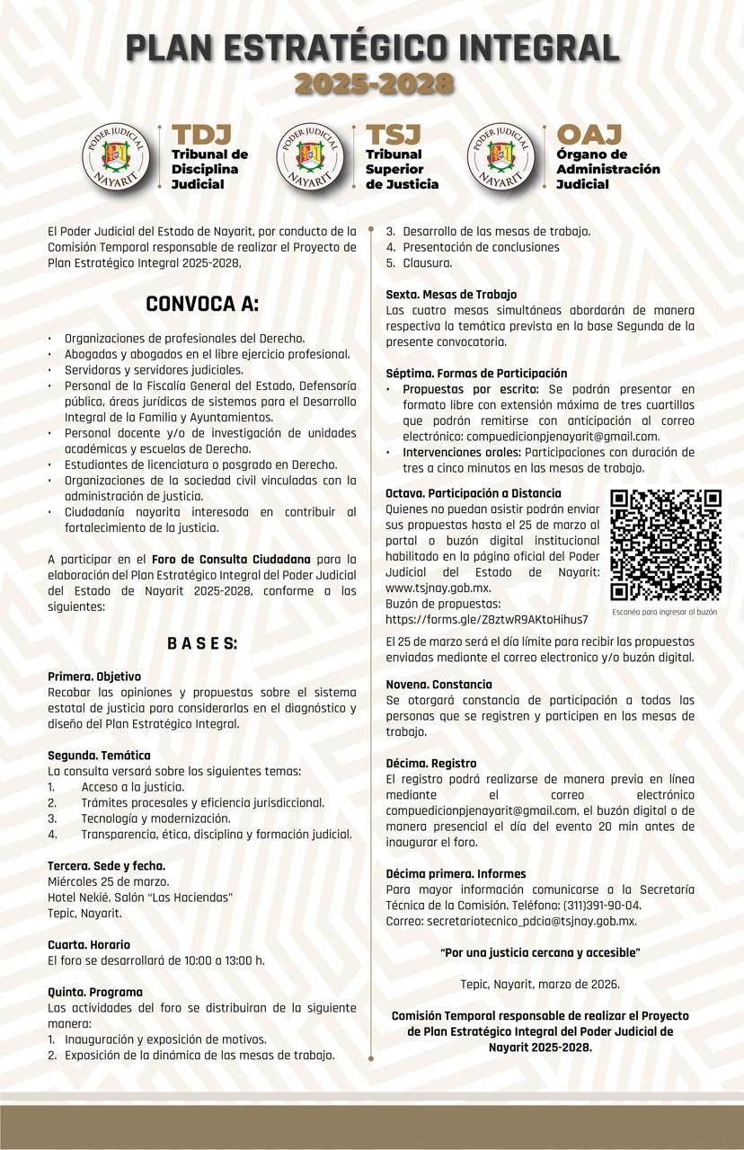 El Poder Judicial del Estado de Nayarit te invita a participar en la construcción del Plan Estratégico Integral 2025–2028, documento que establecerá los objetivos, estrategias y prioridades para el desarrollo integral de la institución, definiendo metas concretas para una impartición de justicia accesible, con sensibilidad social, que se ejerza con plena independencia, profesionalismo y respeto irrestricto de los derechos humanos.