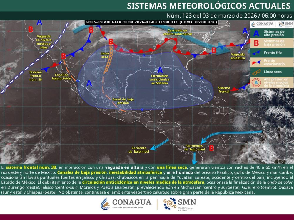 Canales de baja presión sobre el occidente, centro y sureste de México, así como en la península de Yucatán, aunados a inestabilidad atmosférica y al ingreso de humedad proveniente del océano Pacífico, golfo de México y mar Caribe, ocasionarán lluvias puntuales fuertes en Jalisco y Chiapas, chubascos en el occidente, sureste y península de Yucatán, incluyendo el Estado de México en el centro del país.