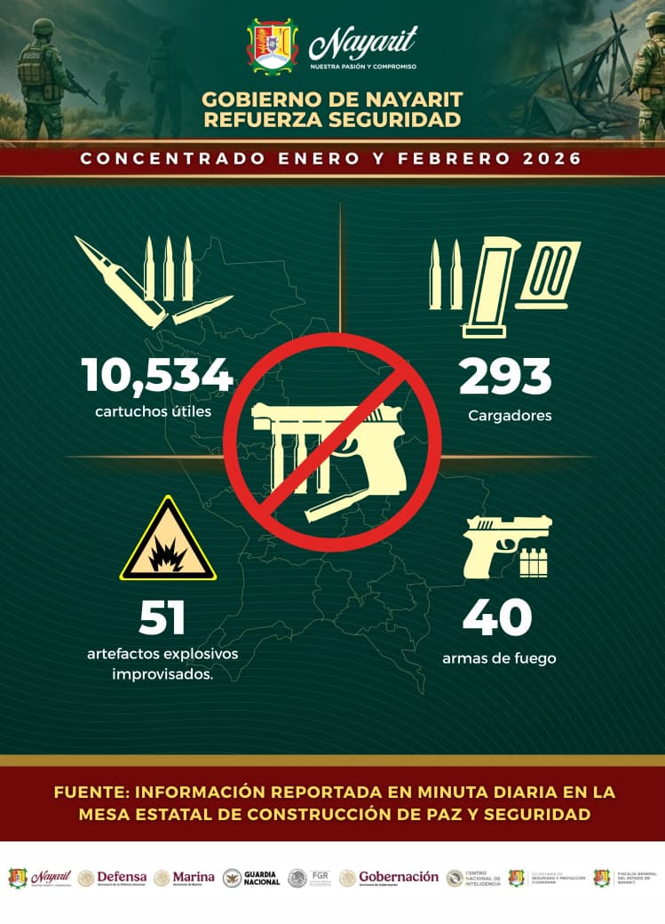 Señaló que, durante enero y febrero, se aseguraron armas, municiones, vehículos y artefactos que representaban un riesgo para la población; también se retiraron de circulación sustancias que afectan a las juventudes y se destruyeron plantíos ilícitos que dañan el tejido social. Enfatizó que detrás de cada cifra hay trabajo operativo, coordinación institucional y decisiones orientadas a cuidar la vida y preservar la paz.