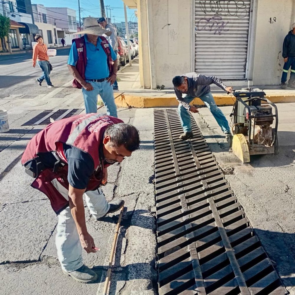 Personal de Obras P煤blicas del Ayuntamiento de Tepic realiza trabajos de rehabilitaci贸n de una secci贸n de rejilla en calle Hidalgo, esquina con P. S谩nchez, con el objetivo de mejorar las condiciones de la vialidad y reducir riesgos al circular.