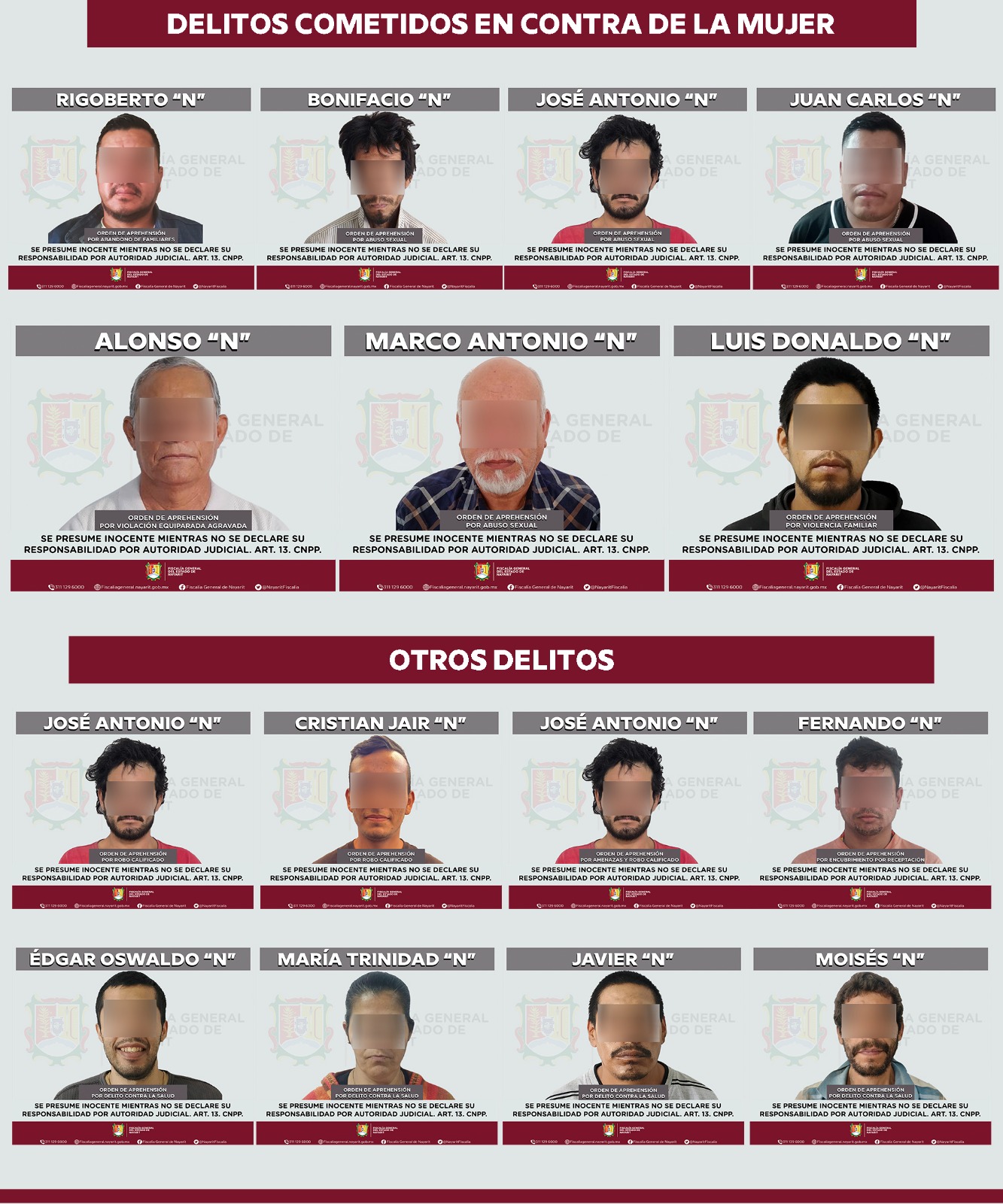Tepic, Nayarit; miércoles 18 de febrero de 2026. – Como resultado de las acciones permanentes para combatir la impunidad y fortalecer la procuración de justicia, la Fiscalía General del Estado de Nayarit cumplimentó el 16 y 17 de febrero un total de 25 órdenes de aprehensión por diversos delitos, en distintos municipios de la entidad y en el estado de Sinaloa.