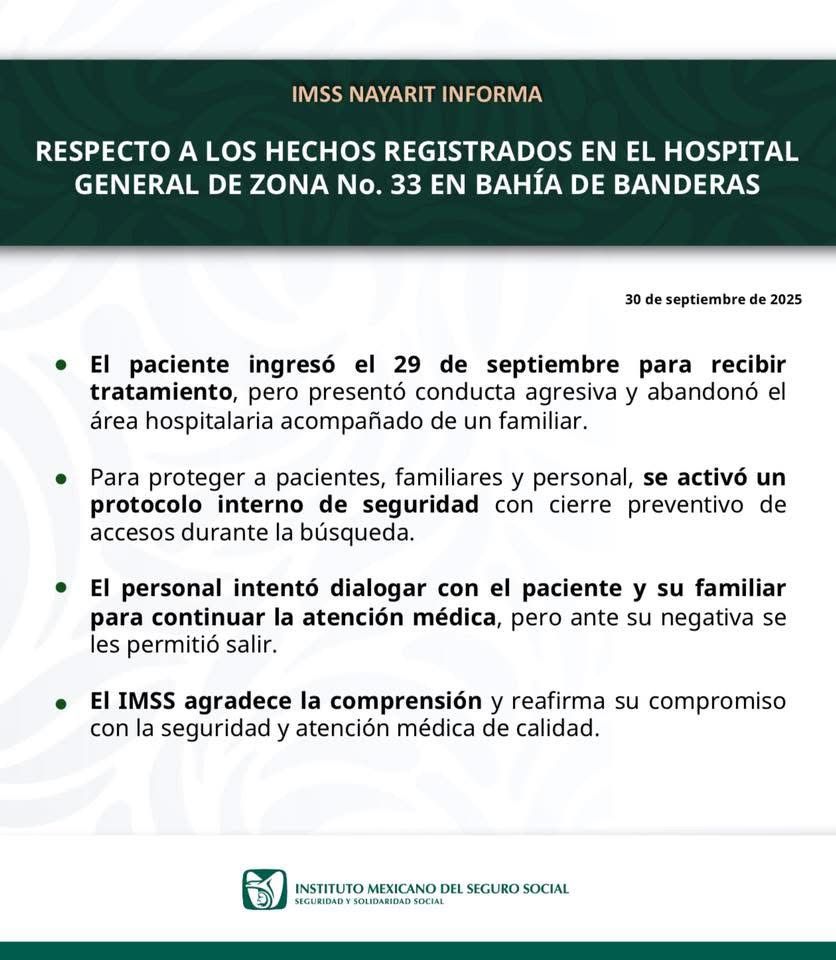 • El IMSS agradece la comprensión de pacientes y familiares ante estas acciones preventivas y reitera su compromiso de mantener instalaciones seguras y ofrecer atención médica oportuna y de calidad.