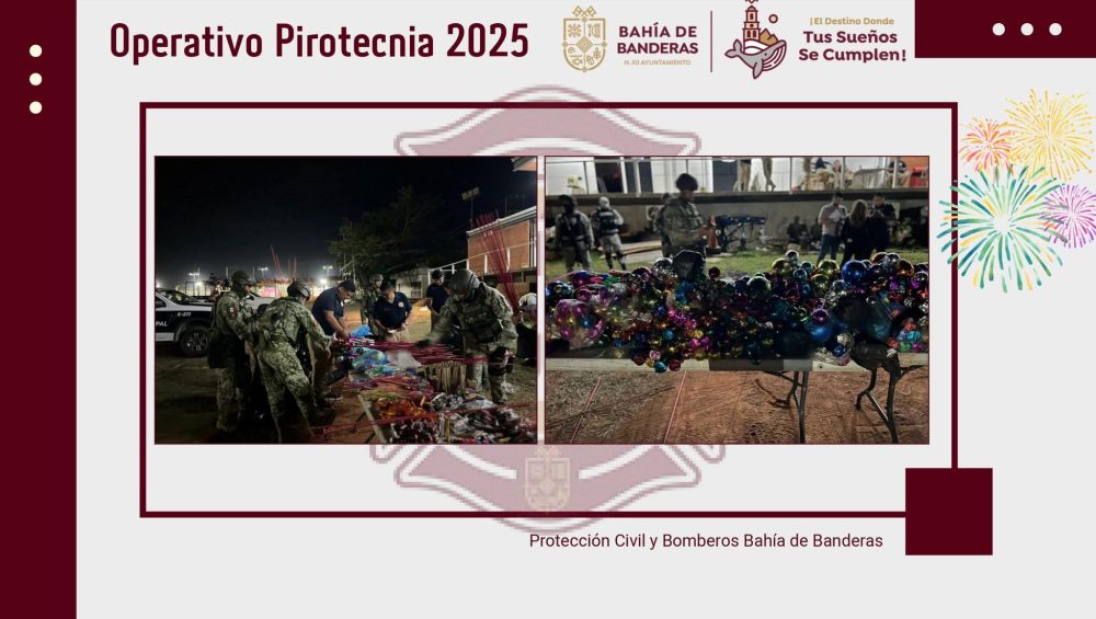 La Dirección de Protección Civil y Bomberos de Bahía de Banderas informó que, como resultado de los operativos preventivos y de decomiso de pirotecnia implementados, se registró saldo blanco, sin incidentes ni personas lesionadas relacionadas con el uso de estos artefactos.