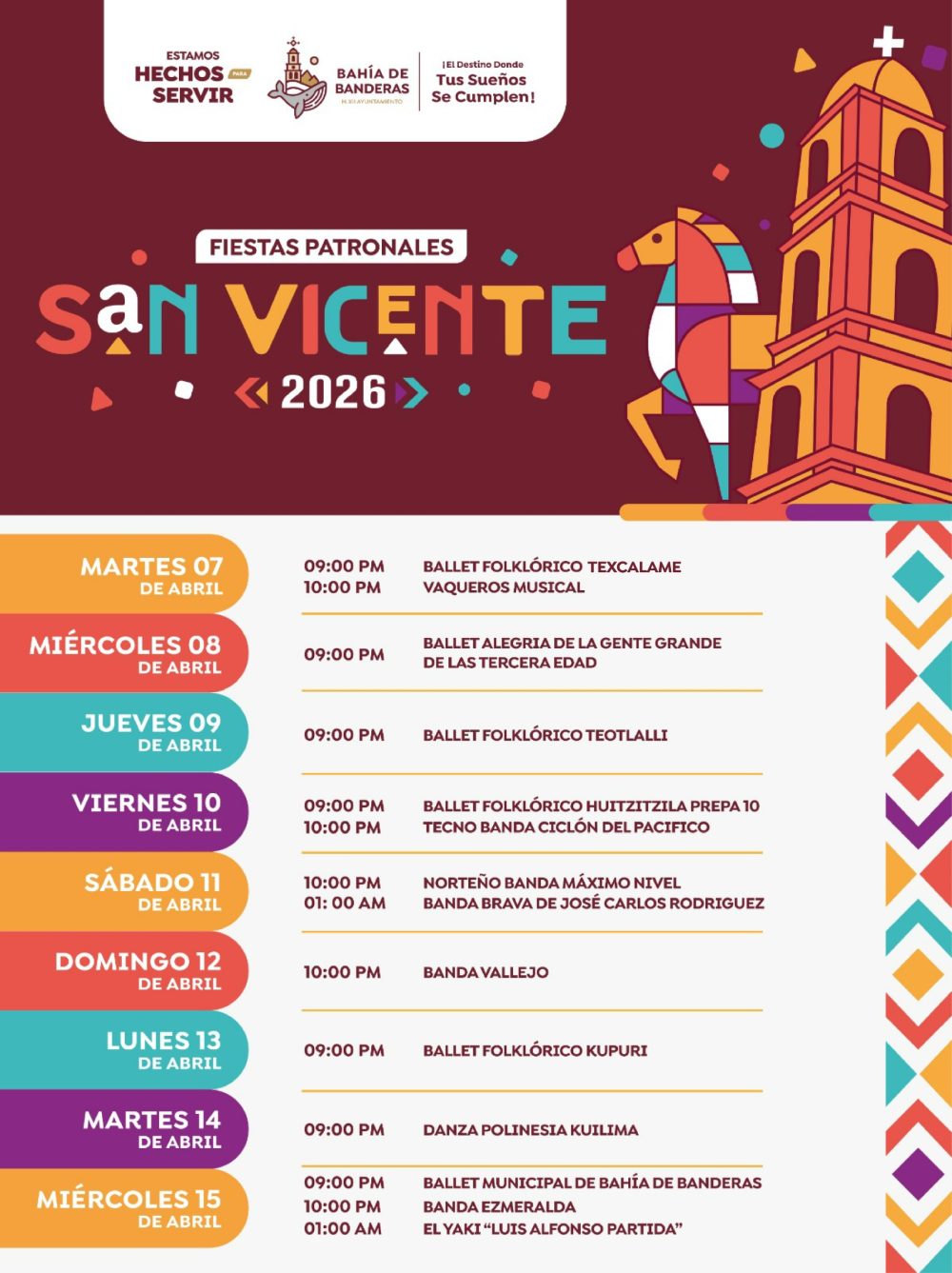 Del 7 al 15 de abril, San Vicente celebrará sus Fiestas Patronales con presentaciones culturales y musicales, incluyendo ballets folclóricos y bandas regionales.