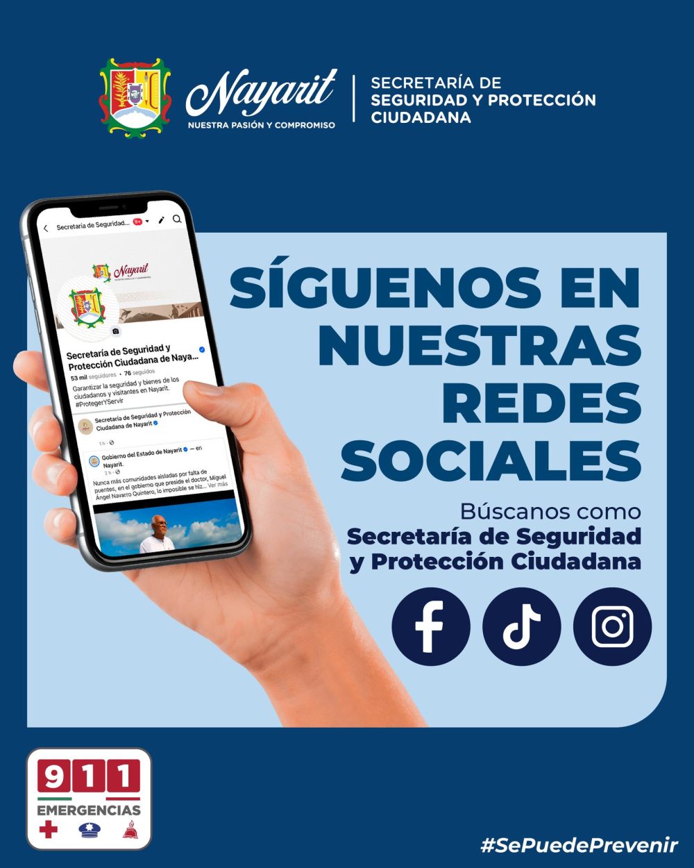 Síguenos en nuestras redes sociales Secretaría de Seguridad y Protección Ciudadana de Nayarit para estar al tanto de nuestras novedades, eventos, recomendaciones de prevención y seguridad, clima, avisos viales y tu denuncia.