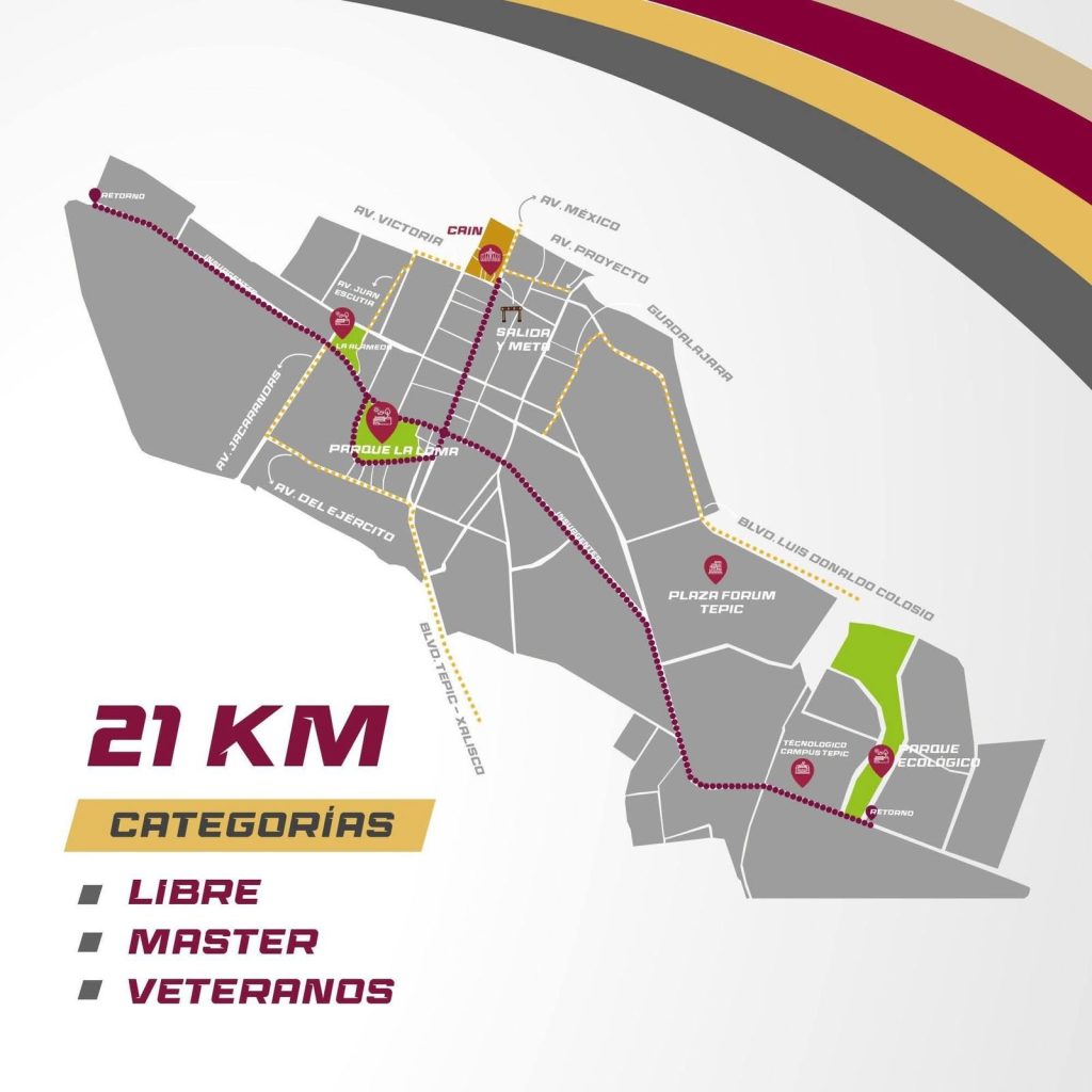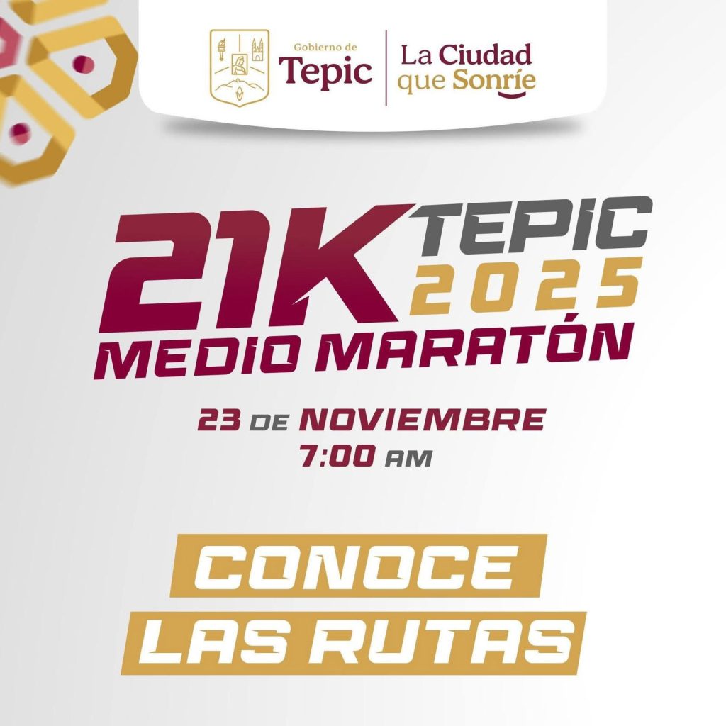 TE COMPARTIMOS LAS RUTAS DEL MEDIO MARATÓN 21K TEPIC 2025, que inicia este domingo 23 de noviembre a partir de las 7 de la mañana, con la participación de miles de corredores.