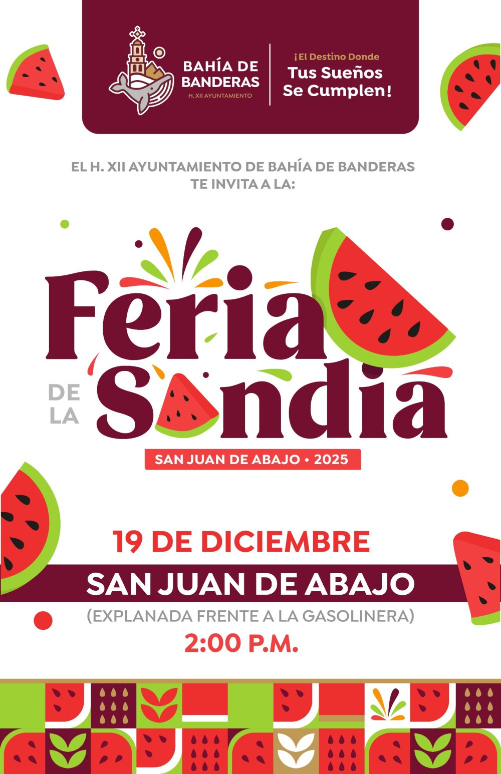El H. XII Ayuntamiento de Bahía de Banderas, que encabeza el presidente municipal Héctor Santana, invita a la ciudadanía a participar en la Feria de la Sandía San Juan de Abajo 2025, un evento que celebra la identidad agrícola y la convivencia familiar.