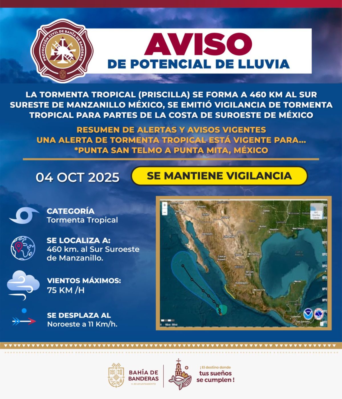 ⛈️ La tormenta tropical #Priscilla se forma a 460 km al sur-sureste de Manzanillo, México. Se emitió vigilancia de tormenta tropical para partes de la costa del suroeste de México.