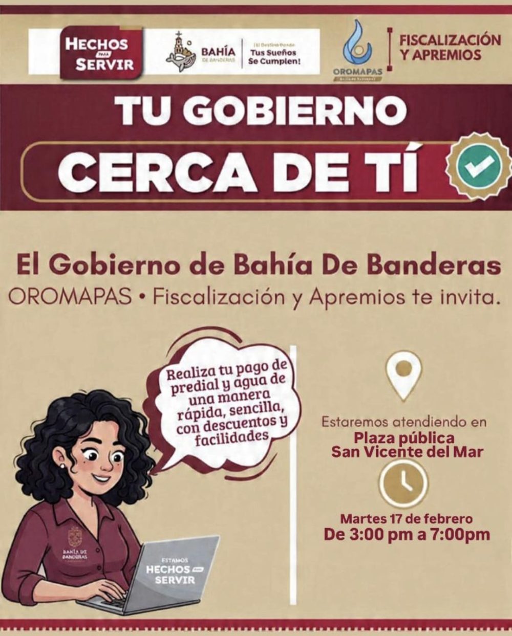 El Gobierno Municipal de Bahía de Banderas, que encabeza el presidente municipal Héctor Santana, a través de OROMAPAS y la Jefatura de Fiscalización y Apremios, realizará una jornada de atención ciudadana para facilitar el pago de predial y agua potable.