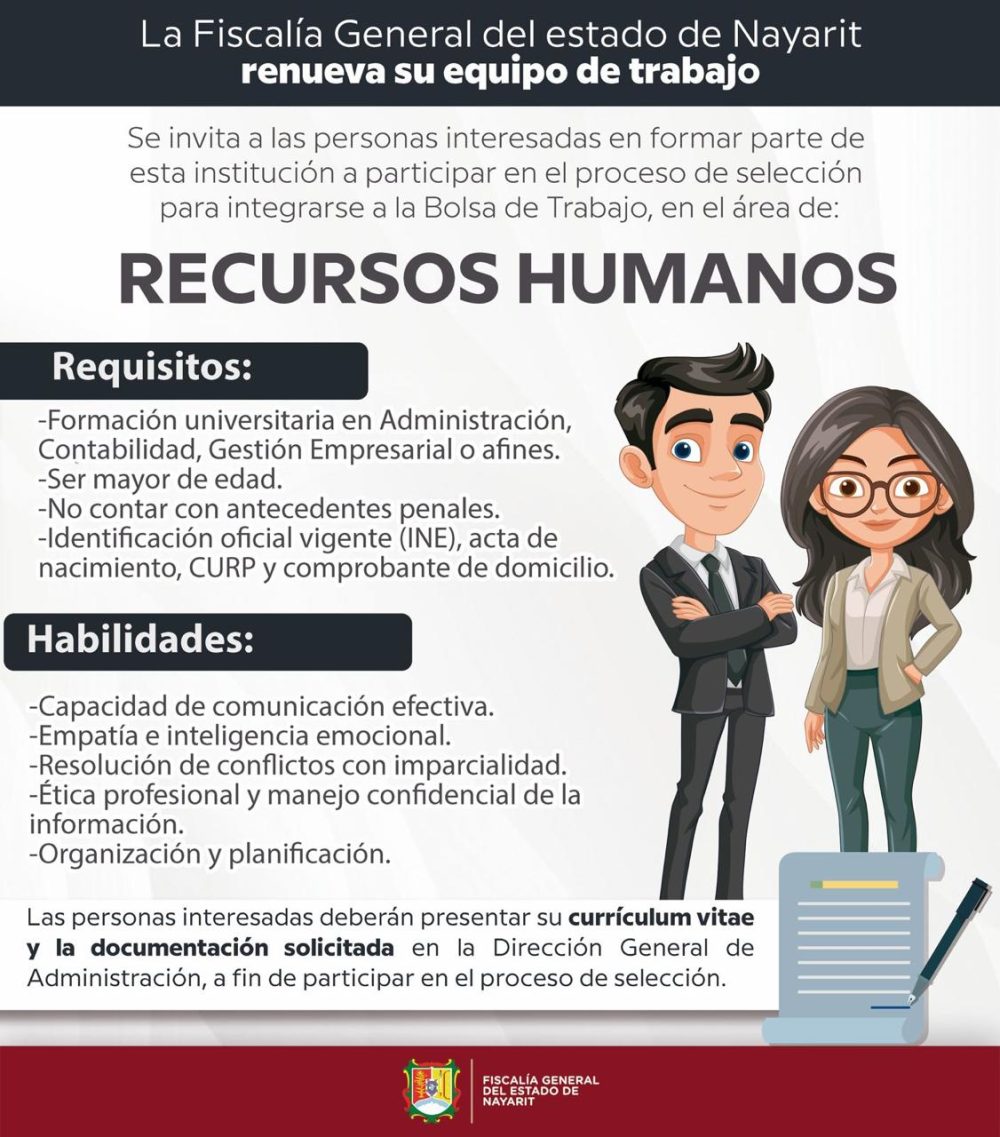 Como parte de la estrategia de mejora continua, la Fiscalía General del Estado de Nayarit convoca a las personas interesadas en integrarse al área de Recursos Humanos.
