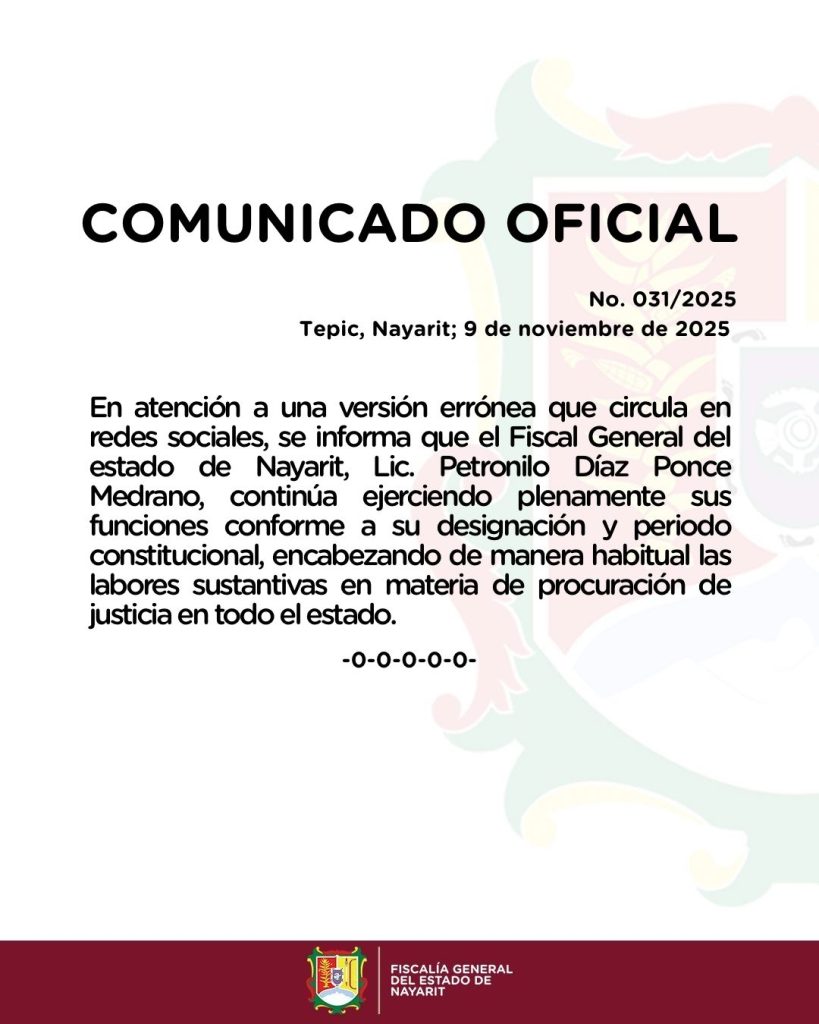 En atención a una versión errónea que circula en redes sociales, se informa que el Fiscal General del estado de Nayarit, Lic. Petronilo Díaz Ponce Medrano, continúa ejerciendo plenamente sus funciones conforme a su designación y periodo constitucional, encabezando de manera habitual las labores sustantivas en materia de procuración de justicia en todo el estado.