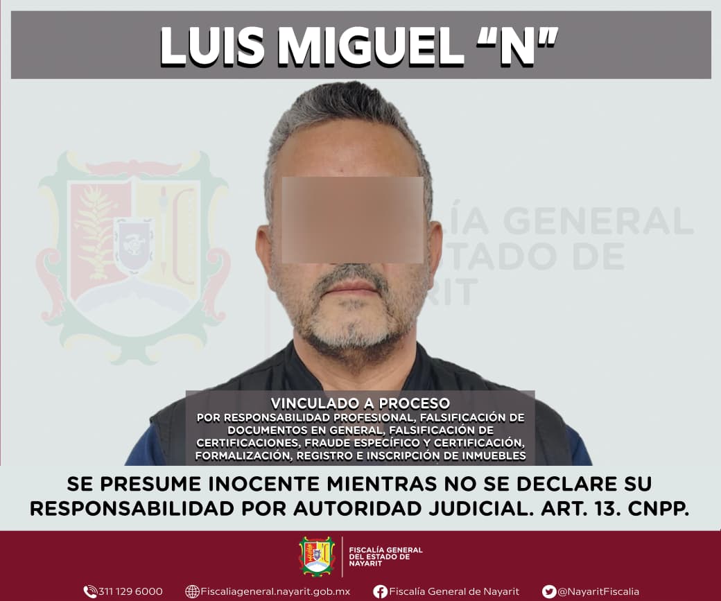 Tepic, Nayarit; 31 de diciembre de 2025.– La Fiscalía General del Estado de Nayarit informa que un Juez de Control dictó auto de vinculación a proceso contra Luis Miguel “N”, Notario Público, por su probable responsabilidad en los delitos de falsificación de documentos en general, falsificación de certificaciones, delitos relacionados con la certificación, formalización, registro e inscripción de inmuebles y operaciones con recursos de procedencia ilícita, fijándose un plazo de cierre de investigación complementaria de cuatro meses.