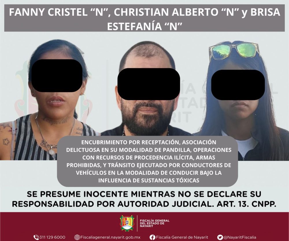 La Fiscalía General del estado de Nayarit informa que Christian Alberto “N”, Brisa Estefanía “N” y Fanny Cristel “N” fueron puestos a disposición de un Juez de Control por su presunta participación en los delitos de encubrimiento por receptación, asociación delictuosa en su modalidad de pandilla, operaciones con recursos de procedencia ilícita, armas prohibidas, y tránsito ejecutado por conductores de vehículos en la modalidad de conducir bajo la influencia de sustancias tóxicas.
