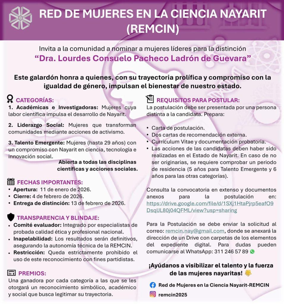 La Red de Mujeres en la Ciencia Nayarit-REMCIN te invita a nominar a mujeres líderes para la «Distinción Dra. Lourdes Consuelo Pacheco Ladrón de Guevara».✨